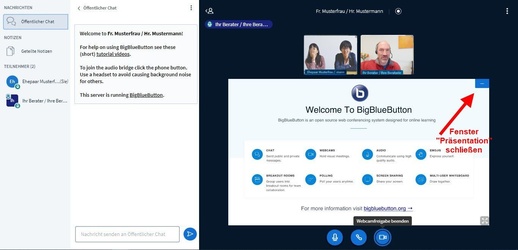 Nach Beenden des Videogespräches schließt sich das Konferenzfenster. Sie können dann die Browserseite mit dem Videotool BigBlueButton schließen.