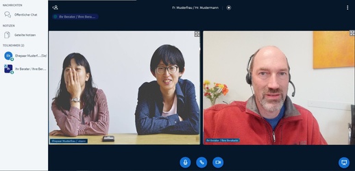 Im Fall einer Paarberatung erhalten Sie beide auf Ihr Gerät je eine E-Mail mit einem Link und sprechen mit der Beraterin oder dem Berater dann in einer 3-er Videokonferenz. (Bitte achten Sie auf die Browser-Auswahl: Wir empfehlen die Nutzung von Google Chrom)