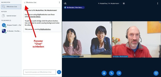Die Videofenster werden noch größer, wenn Sie auch das CHAT-Fenster links schließen.